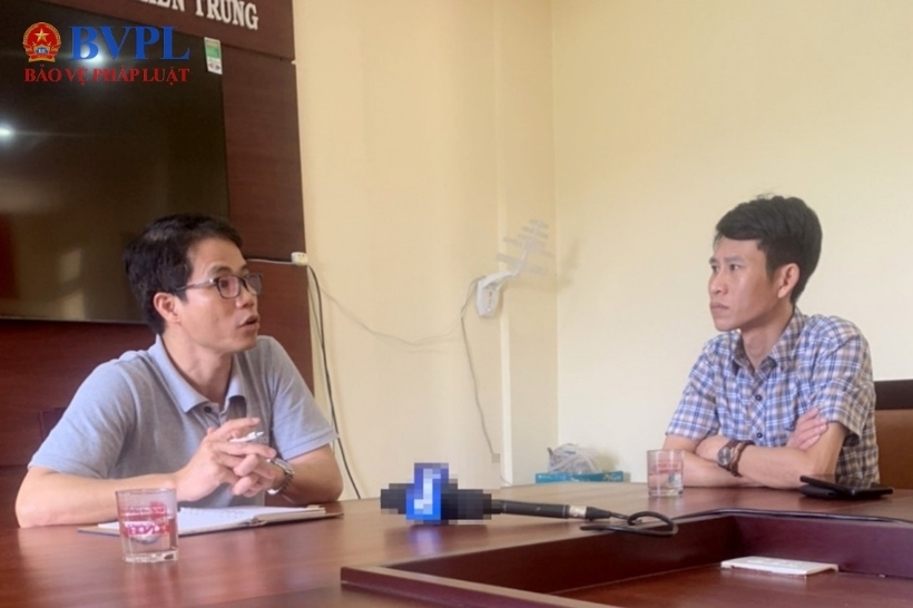 | Ông Nguyễn Hoàng Tuấn (bên trái) làm việc với PV Báo Bảo vệ pháp luật thời điểm Báo Bảo vệ pháp luật phản ánh sự việc về việc trùng tu Điện Kiến Trung. |