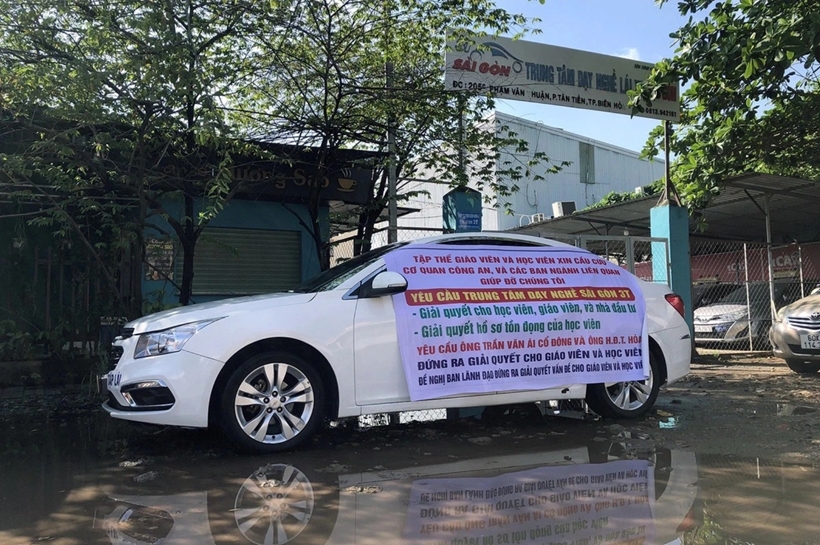 | Giáo viên, học viên giăng băng rôn "kêu cứu" sau khi giám đốc bị bắt, Trung tâm dạy nghề lái xe Sài Gòn tạm dừng hoạt động (ảnh chụp tháng 6-2023). |