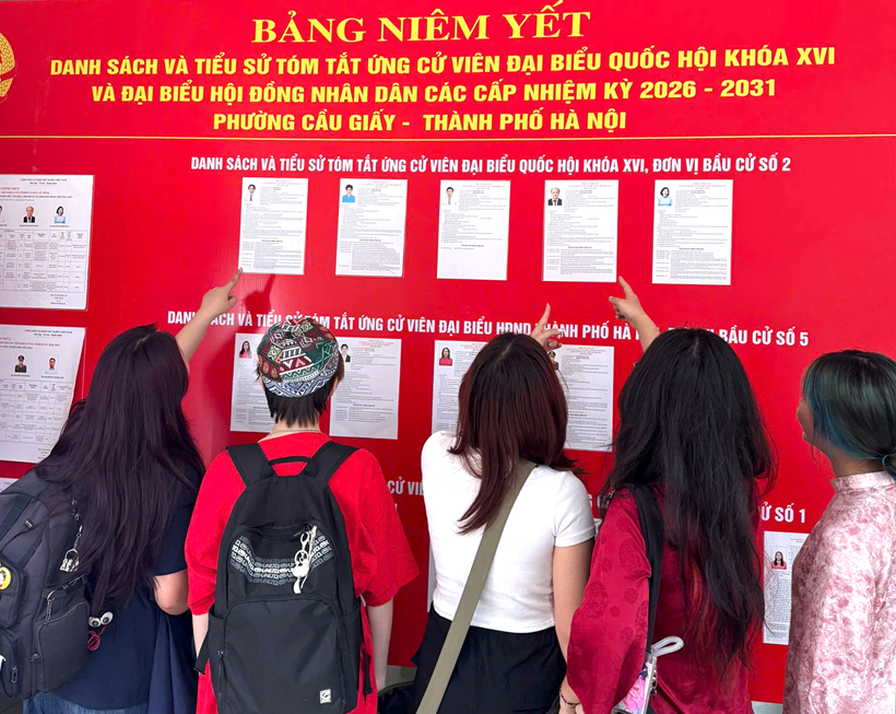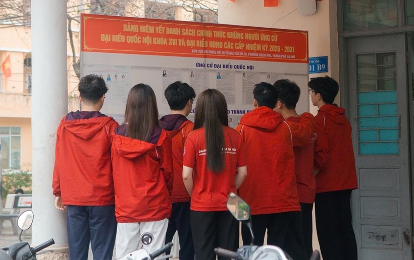 | Cử tri là sinh viên Đại học Kinh tế Quốc dân theo dõi danh sách ứng người ứng cử đại biểu Quốc hội khóa XVI và đại biểu HĐND các cấp nhiệm kỳ 2026 - 2031. |