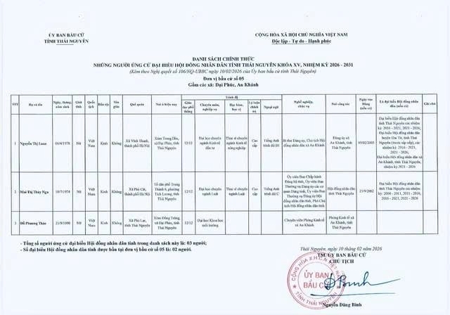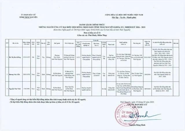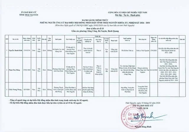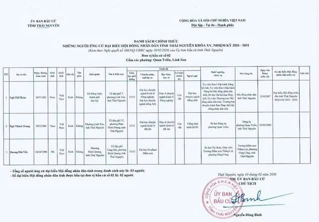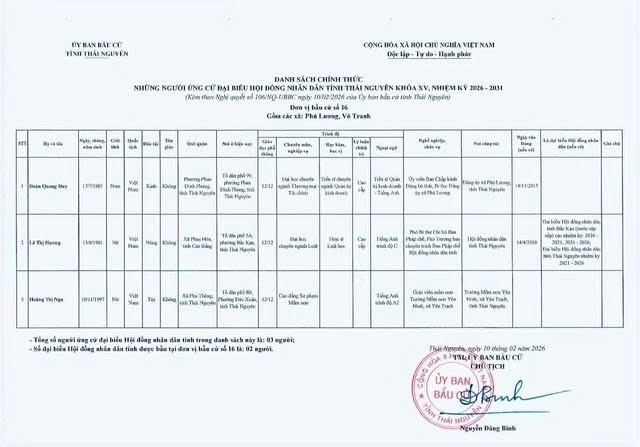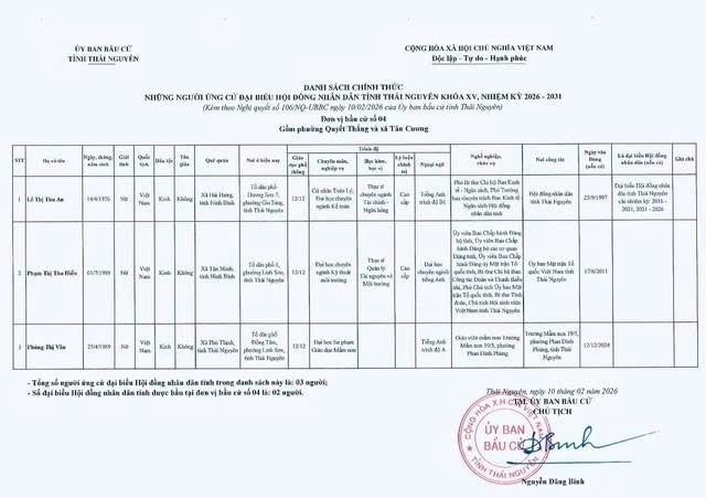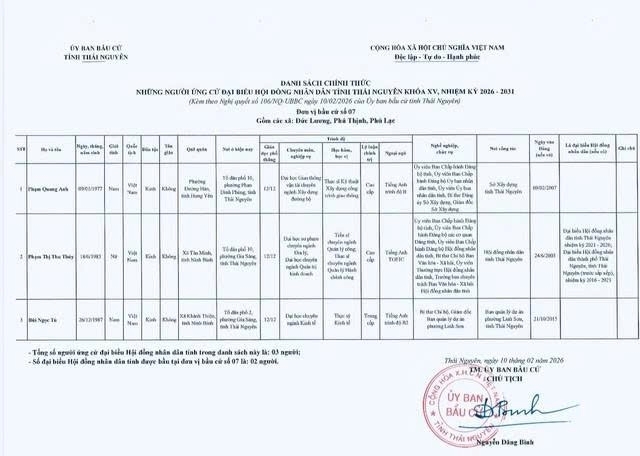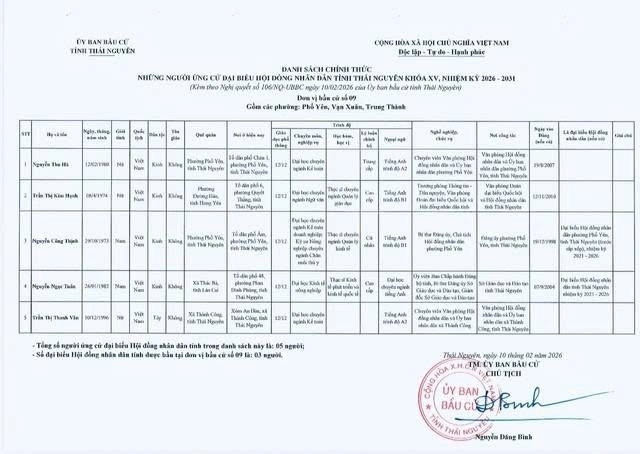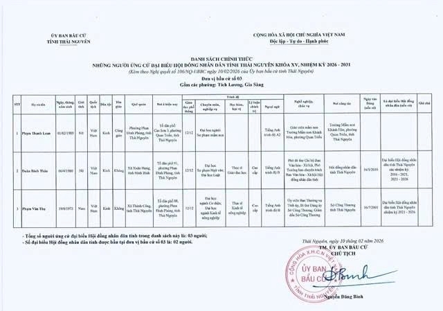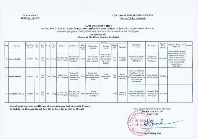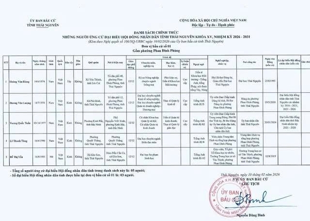 Danh sách chính thức những người ứng cử Đại biểu Hội đồng nhân dân tỉnh Thái Nguyên khóa XV, nhiệm kỳ 2026 - 2031 tại đơn vị bầu cử số 1 phường Phan Đình Phùng.