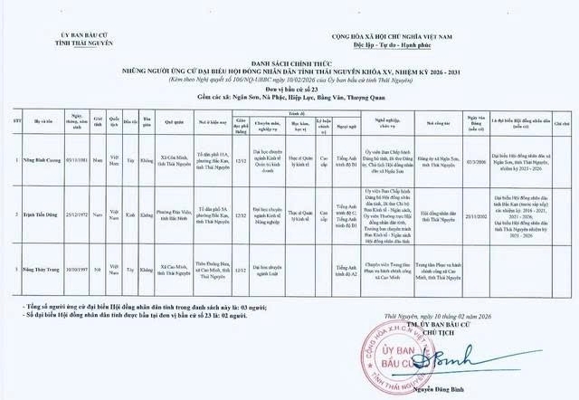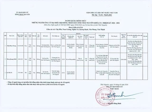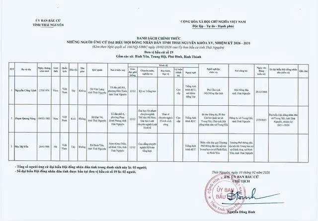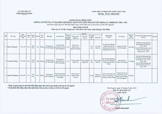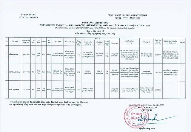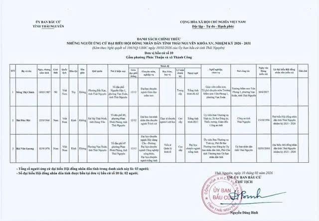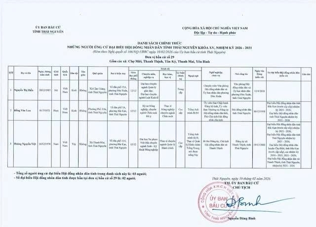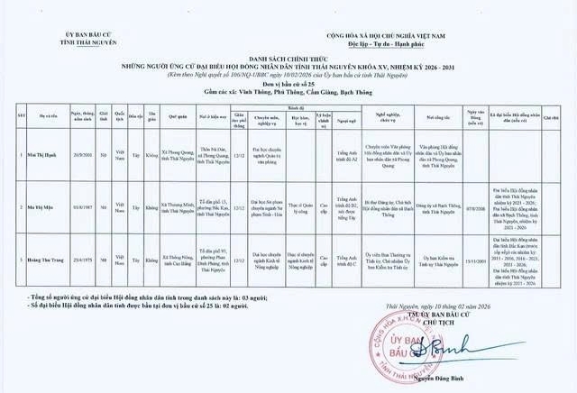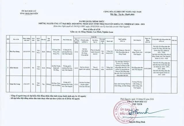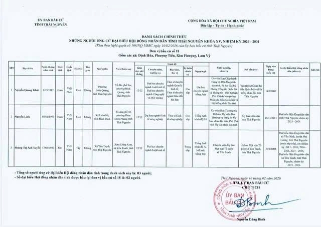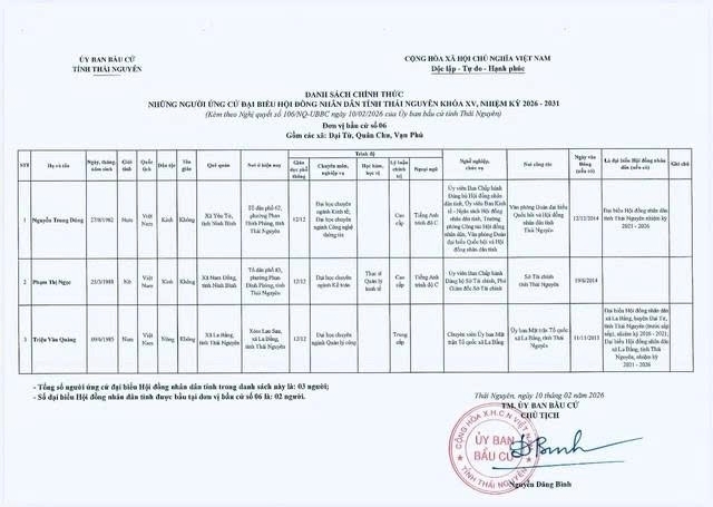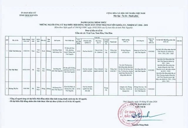 Danh sách chính thức những người ứng cử Đại biểu Hội đồng nhân dân tỉnh Thái Nguyên khóa XV, nhiệm kỳ 2026 - 2031 tại đơn vị bầu cử số 1 phường Phan Đình Phùng.