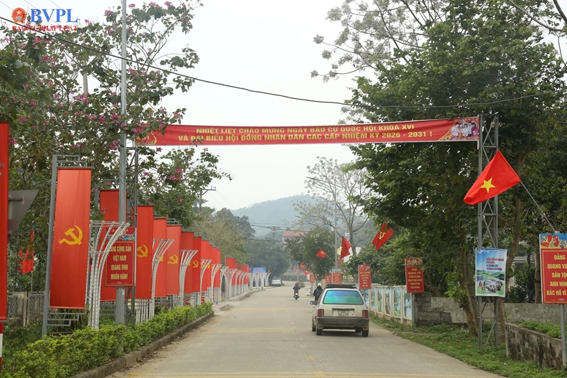 khắp các trục đường chính, khu dân cư và nhà văn hóa thôn được trang hoàng cờ hoa, băng rôn, pano rực rỡ.