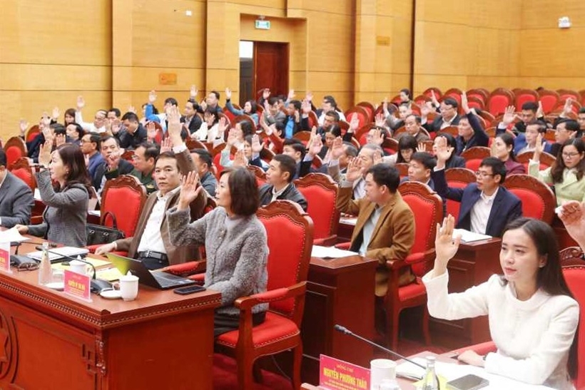 | Các đại biểu biểu quyết thống nhất lựa chọn danh sách ứng cử Quốc hội và HĐND. Ảnh: QMG |