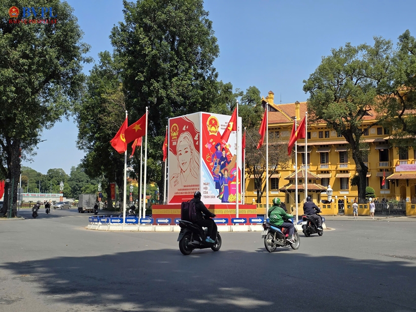 | Tại nút giao Điện Biên Phủ – Độc Lập, các banner cỡ lớn được bố trí trang trọng cùng cờ đỏ sao vàng tung bay gần khu vực Lăng Chủ tịch Hồ Chí Minh, tạo điểm nhấn nổi bật. |