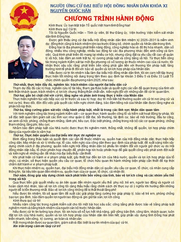 | Chương trình hành động của đồng chí Nguyễn Quốc Hân, ứng cử viên Đại biểu HĐND tỉnh Đồng Nai khóa XI. |