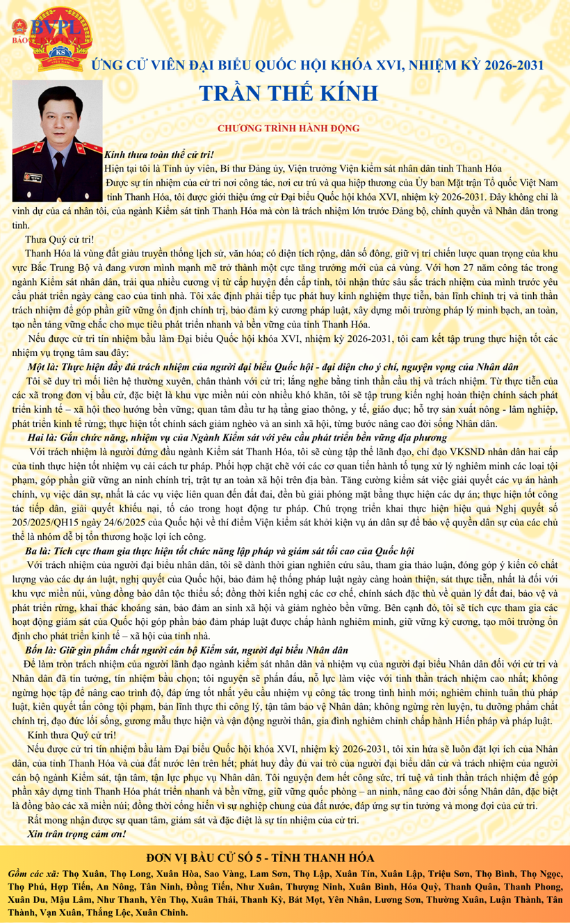 | Chương trình hành động của đồng chí Trần Thế Kính, ứng cử viên Đại biểu Quốc hội khóa XVI, nhiệm kỳ 2026-2031. |