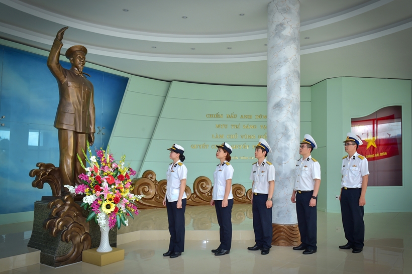 | Kiểm sát viên VKSQS Quân chủng Hải quân dâng hoa trước Tượng đài Chủ tịch Hồ Chí Minh tại Nhà Truyền thống của đơn vị. Ảnh Kim Mạnh. |