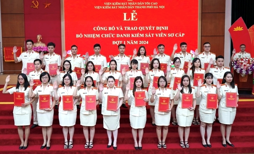 | Các đồng chí được trao quyết định bổ nhiệm chức danh Kiểm sát viên sơ cấp thuộc VKSND Thành phố Hà Nội tuyên thệ. (Ảnh minh hoạ) |