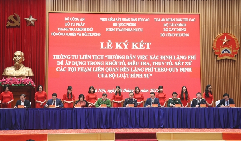 | Quang cảnh Lễ ký Thông tư liên tịch hướng dẫn việc xác định lãng phí trong khởi tố, điều tra, truy tố, xét xử các tội phạm liên quan đến lãng phí theo Bộ luật Hình sự do VKSND tối cao chủ trì tổ chức. (Ảnh minh hoạ) |