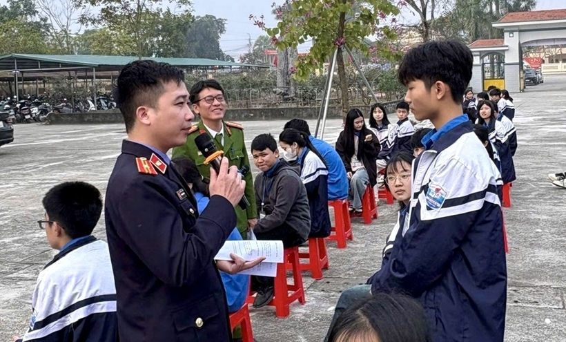 | VKSND khu vực phối hợp với cơ quan Công an tuyên truyền, phổ biến các quy định của pháp luật về vũ khí, vật liệu nổ, công cụ hỗ trợ và pháo cho học sinh. (Ảnh minh hoạ) |
