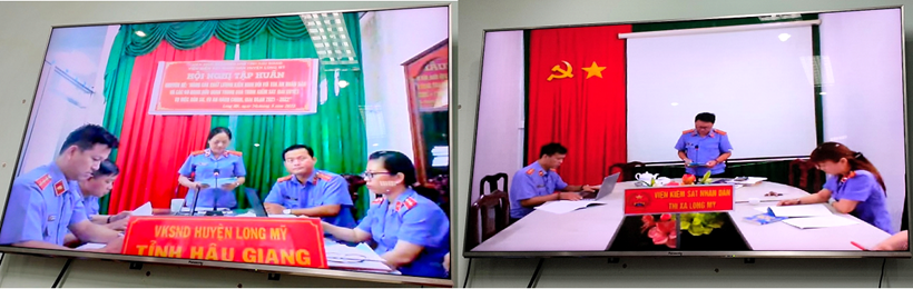 Đồng chí Hoàng Thị Kim Xuyến, Viện trưởng VKSND huyện Long Mỹ (ảnh trái); Đồng chí Đỗ Văn Tạo, Phó viện trưởng VKSND thị xã Long Mỹ (ảnh phải) trình bày chuyên đề tại điểm cầu VKS cấp huyện.