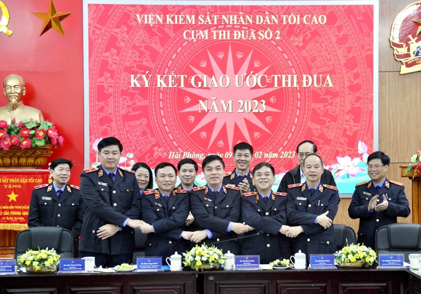 Trong khuôn khổ Hội nghị, dưới sự chứng kiến của Vụ trưởng Vụ 16 cùng các đồng chí trong Hội đồng thi đua Cụm Thi đua số 2, lãnh đạo 5 VKSND đã đại diện cho công chức, người lao động các đơn vị thuộc Cụm đã tổ chức ký giao ước thi đua năm 2023. Ngoài việc cam kết hoàn thành xuất sắc các nhiệm vụ trọng tâm năm 2023, cả 5 đơn vị đều đăng ký danh hiệu Cờ thi đua của Chính phủ.