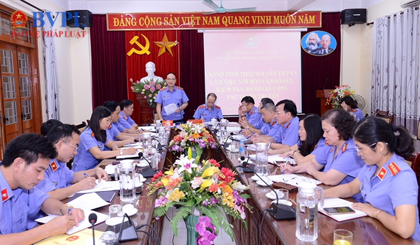 | Đồng chí Nguyễn Văn Thắng, Phó trưởng Ban Thường trực BCĐ công tác tuyên truyền ngành KSND làm việc với VKSND tỉnh Thái Nguyên. |