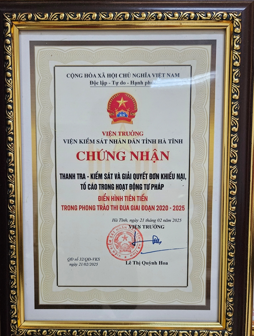 Kết quả trong năm qua, Phòng Thanh tra - Khiếu tố VKSND tỉnh Hà Tĩnh đã đạt được nhiều thành tích nổi bật: Được công nhận “Tập thể điển hình tiên tiến giai đoạn 2020–2025”, có nhiều cá nhân được khen thưởng, trong đó một đồng chí được tôn vinh là điển hình trong học tập và làm theo tư tưởng, đạo đức, phong cách Hồ Chí Minh; hai đồng chí có sáng kiến cấp cơ sở được công nhận và áp dụng hiệu quả trong thực tiễn công tác.