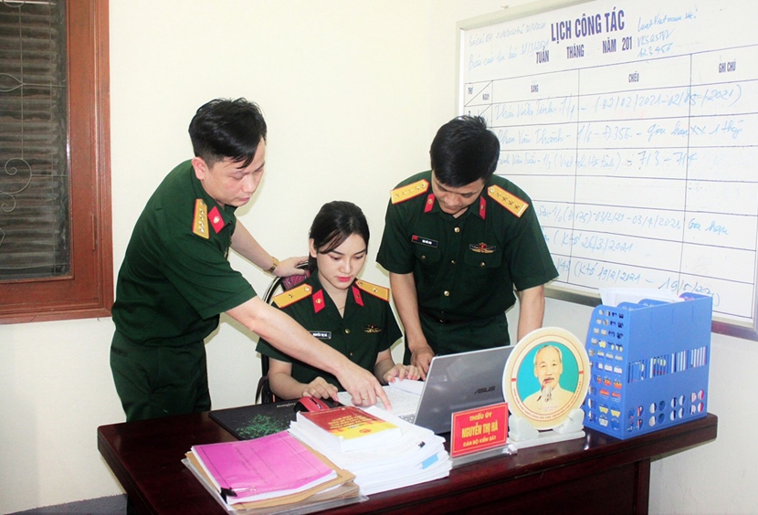 | Kiểm sát viên VKSQS Quân khu 4 trao đổi công tác. Ảnh Nguyễn Đen |