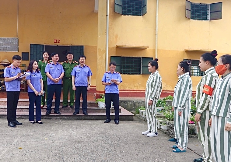 | Đồng chí Lại Anh Tuấn, Vụ trưởng Vụ 8, VKSND tối cao và thành viên đoàn trực tiếp kiểm sát tại trại giam, gặp hỏi phạm nhân tại Trại giam Tân Lập, Bộ Công an. (Ảnh minh hoạ) |