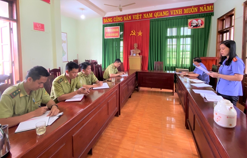 | Đoàn công tác do đồng chí Hà Thị Phương Thảo, Phó Viện trưởng VKSND huyện Đắk Glong làm Trưởng Đoàn trực tiếp kiểm sát tại Hạt Kiểm lâm huyện. |