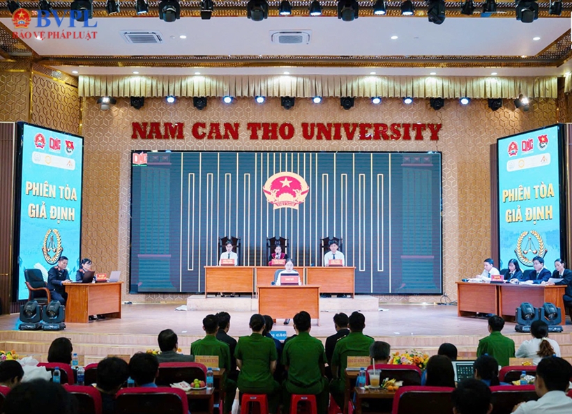 | Hình ảnh phiên tòa giả định vụ án “Tổ chức sử dụng trái phép chất ma túy” được tổ chức tại Trường Đại học Nam Cần Thơ. |