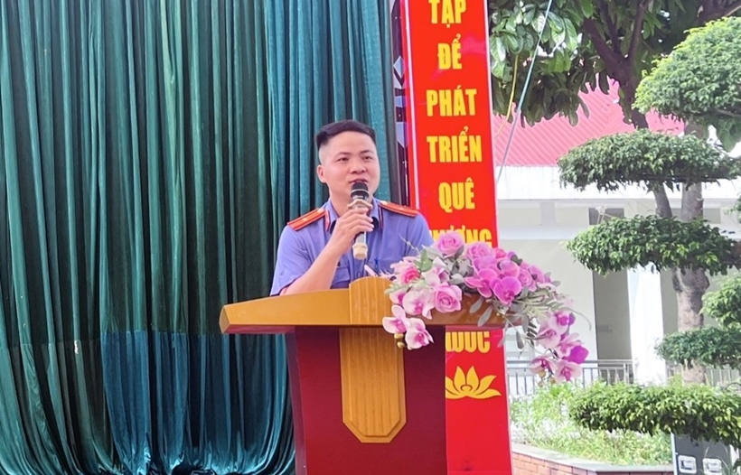 Kiểm sát viên tuyên truyền pháp luật cho các em học sinh. |