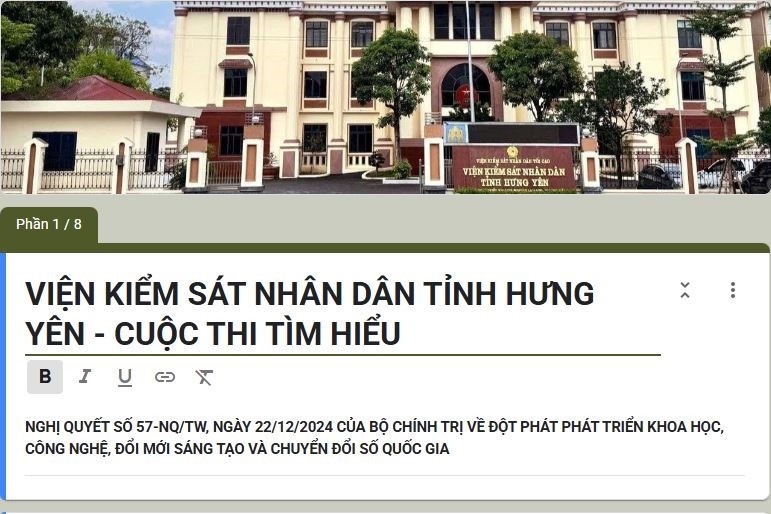 Thực hiện Nghị quyết 57-NQ/TW ngày 22/12/2024 của Bộ chính trị về đột phá phát triển khoa học, công nghệ, đổi mới sáng tạo và chuyển đổi số Quốc gia và Kế hoạch hành động số 09-KH/ĐU ngày 29/4/2025 của Đảng ủy VKSND tối cao về thực hiện Nghị quyết 57-NQ/TW ngày 22/12/2024 của Bộ chính trị, VKSND tỉnh Hưng Yên đã tổ chức Cuộc thi “Tìm hiểu Nghị quyết số 57-NQ/TW ngày 22/12/2024 của Bộ Chính trị về đột phá phát triển khoa học, công nghệ, đổi mới sáng tạo và chuyển đổi số Quốc gia” trong toàn ngành.