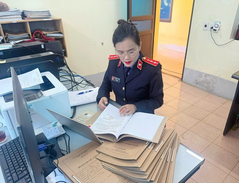 | Kiểm sát viên kiểm tra hồ sơ người bị tạm giữ, tạm giam tại Trại tạm giam Công an tỉnh Lai Châu. |