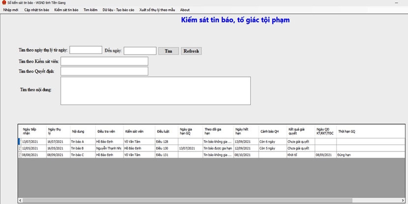 Về chức năng hoạt động, phần mềm mới xây dựng của VKSND tỉnh Tiền Giang đảm bảo đáp ứng được các tiêu chí: theo dõi ngày thụ lý, ngày tiếp nhận; xác định Điều tra viên, Kiểm sát viên phụ trách; tình trạng giải quyết, ngày quá hạn giải quyết; cảnh báo tin báo đến thời hạn giải quyết; trích xuất tin báo quá hạn giải quyết... để phục vụ cho công tác quản lý, chỉ đạo điều hành của Viện kiểm sát hai cấp.