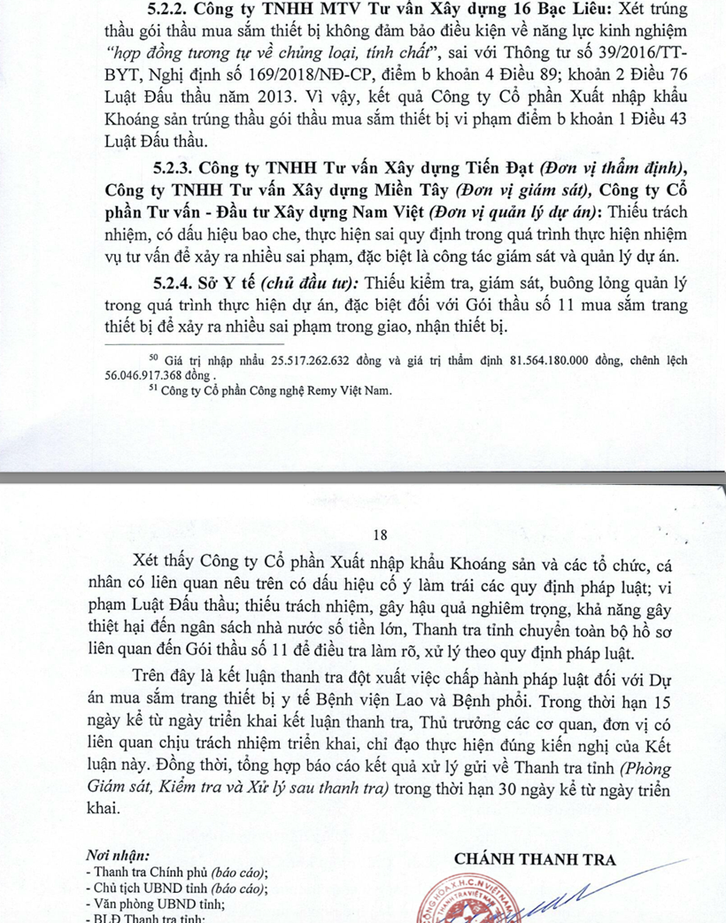 Đối với Công ty TNHH MTV Tư vấn Xây dựng 16 Bạc Liêu đã xét trúng thầu gói thầu mua sắm thiết bị không đảm bảo điều kiện về năng lực kinh nghiệm "hợp đồng tương tự về chủng loại, tính chất", sai với Thông tư số 39 của Bộ Y tế. Vì vậy, kết quả Công ty Cổ phần xuất nhập khẩu Khoáng Sản trúng thầu gói thầu mua sắm thiết bị y tế vi phạm điểm b khoản 1 Điều 43 Luật Đấu thầu.
