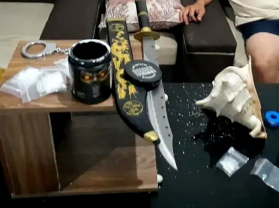 Ngoài ra, khi kiểm tra phòng bếp của khách sạn này, lực lượng Công an còn phát hiện 11 viên nén màu xanh nước biển có trọng lượng 7,75gam nghi là ma túy tổng hợp. 46,3 gam (kể cả bao bì) tinh thể màu trắng nghi là ma túy đá (ketamine). 1 còng khóa số tám, 1 mã tấu dài 50cm. Tổng cộng khối lượng ma túy thu giữ tại cơ sở kinh doanh dịch vụ lưu trú là 12,89 gam ma túy tổng hợp và 49,46 gam ma túy đá (ketamine).