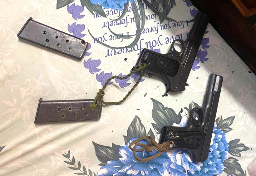 Tiến hành khám xét, lực lượng Công an đã thu giữ thêm 2 khẩu súng K54 có gắn hộp tiếp đạn, bên trong có 14 viên đạn.