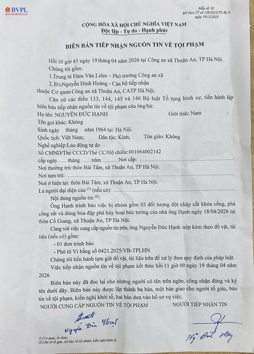 Theo thông tin được biết, sáng nay (19/4/2026), Công an xã Thuận An đã có buổi làm việc, lập Biên bản tiếp nhận nguồn tin về tội phạm và các tài liệu mà anh Hạnh cung cấp để giải quyết theo quy định.