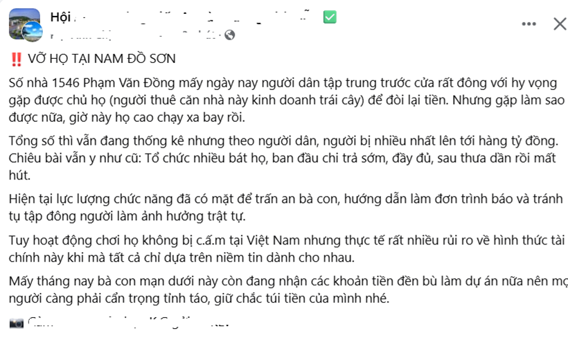 Nhiều người dân đã tụ tập trước một cửa hàng trái cây trên đường Phạm Văn Đồng, phường Nam Đồ Sơn, Hải Phòng để livestream lên mạng xã hội về việc họ tổ chức chơi hụi nhưng thời gian gần đây không liên lạc được với “chủ hụi”.