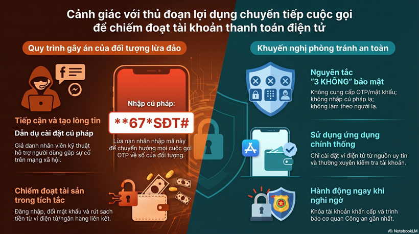 Đáng chú ý, một thủ đoạn mới được ghi nhận là lợi dụng tính năng chuyển tiếp cuộc gọi (Call Forwarding). Các đối tượng giả danh nhân viên kỹ thuật, hướng dẫn người dùng thao tác cài đặt chuyển tiếp cuộc gọi bằng các cú pháp lạ với lý do “hỗ trợ kỹ thuật” hoặc “bảo mật tài khoản”. Thực chất, hành vi này nhằm chuyển toàn bộ cuộc gọi, trong đó có các cuộc gọi chứa mã OTP từ ngân hàng hoặc ứng dụng thanh toán, về số điện thoại của đối tượng. Khi đã chiếm được mã xác thực, chúng dễ dàng đăng nhập, chiếm quyền kiểm soát tài khoản và thực hiện các giao dịch chuyển tiền, rút tiền hoặc thanh toán trực tuyến để chiếm đoạt tài sản.
