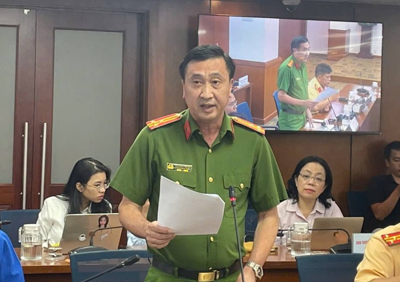 | Thượng tá Trần Xuân Phương tại họp báo cung cấp thông tin về các vấn đề kinh tế - xã hội trên địa bàn TP Hồ Chí Minh. |