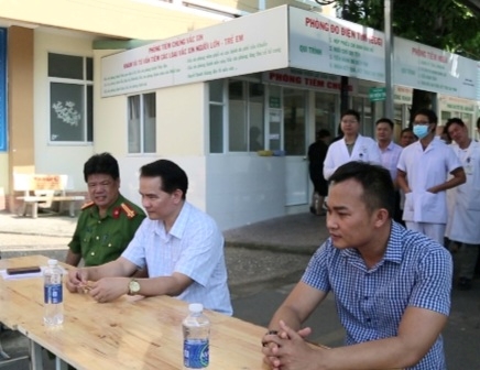 | Bác sĩ CKII Trần Thanh Sang, Phó Giám đốc Bệnh viện Lê Văn Việt; Trung tá Thái Vân Anh, Phó Trưởng Công an phường Tăng Nhơn Phú A, ông Nguyễn Tuấn Quân, Giám đốc điều hành Công ty Dịch vụ bảo vệ Hoàng Việt cùng tham dự buổi diễn tập. Ảnh: Ngọc Tuấn. |