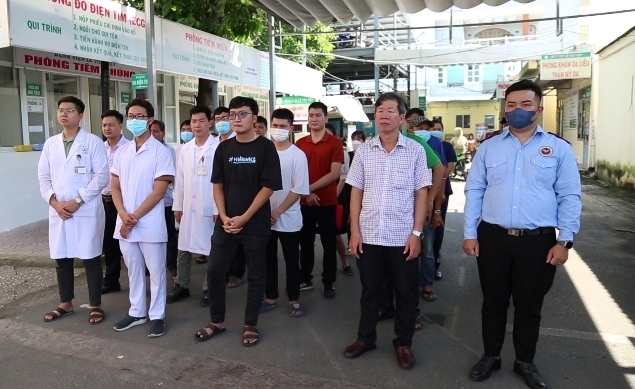 | Cán bộ, bác sỹ, nhân viên y tế cùng tham dự buổi diễn tập giả định tại Bệnh viện Lê Văn Việt. Ảnh: Ngọc Tuấn. |