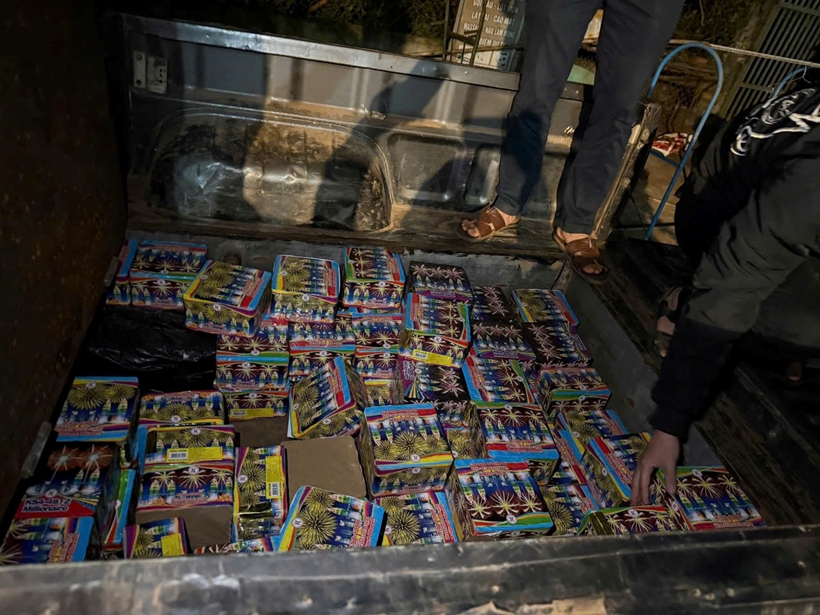| Pháo hoa nổ được cất giấu trong ngăn chứa bí mật của thùng xe ô tô tại nhà Phạm Văn Đạt. |