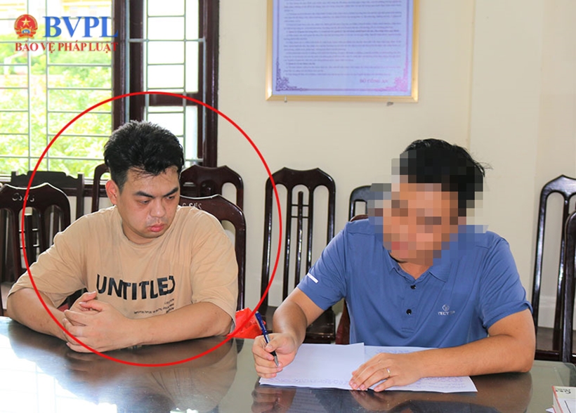| Đối tượng Lê Bùi Trung Hiếu (khoanh đỏ) tại cơ quan Công an. |