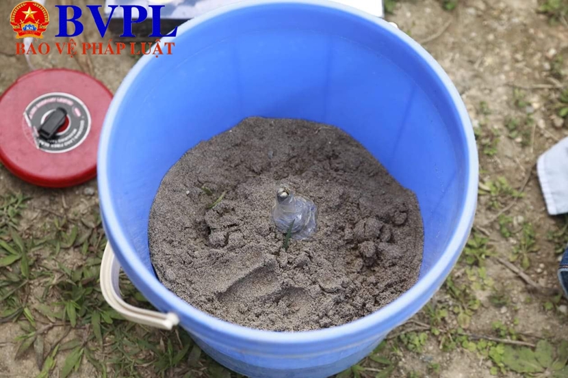 | Phát hiện quả lựu đạn chưa nổ, Cảnh sát dùng băng dính bọc chặt quả lựu đạn được tìm thấy rồi cho vào xô cát để giữ tránh va đập để đưa về xử lý. |