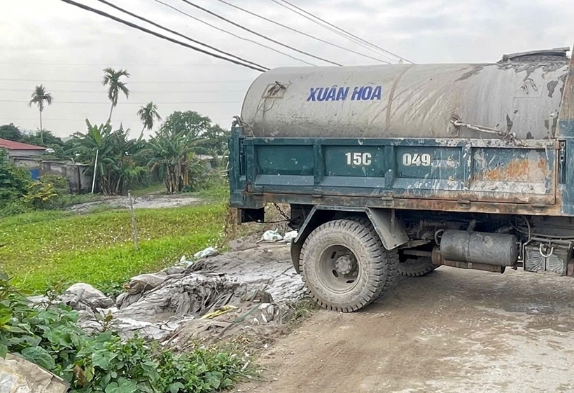 | Chiếc xe bồn xả thải xuống bờ tả đê sông Lạch Tray. |