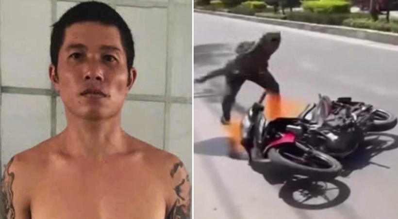 Sau đó, người này đạp đổ xe, mở nắp bình xăng, quẹt lửa đốt xe. Khi lửa cháy to, đối tượng tiếp tục la lối, nhặt đá trên vỉa hè đập phá xe, kéo xe ra giữa đường, rồi cùng người phụ nữ bỏ đi.