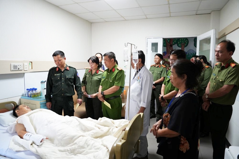 | Đoàn cán bộ Công an tỉnh Lâm Đồng thăm hỏi Thiếu tá Phạm Nguyễn Đức Lâm đang điều trị vết thương tại bệnh viện. Ảnh: CA. |