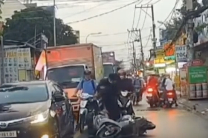 Nhóm thanh niên đi xe máy ép ngã hai em học sinh, sau đó một đối tượng dùng nón bảo hiểm đánh liên tục vào nạn nhân.