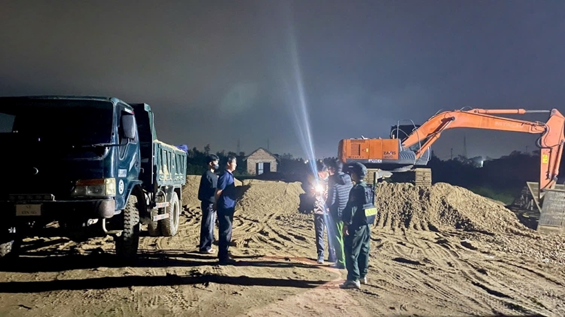 | Lực lượng chức năng phát hiện, bắt quả tang hành vi khai thác cát trái phép do đối tượng Nguyễn Chí Tần cầm đầu. |