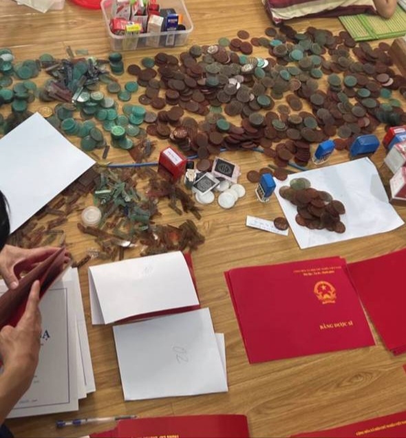 Kết quả kiểm tra, khám xét đã thu giữ: 2 máy tính, 20 điện thoại di động, 1.000 con dấu giả, 3.000 tem giả, 6.000 phôi bằng cấp giả, 1.100 bằng cấp giả đã in ấn và nhiều máy in màu, máy scan, máy ép nhựa để phục vụ cho hoạt động sản xuất bằng cấp, giấy tờ giả.