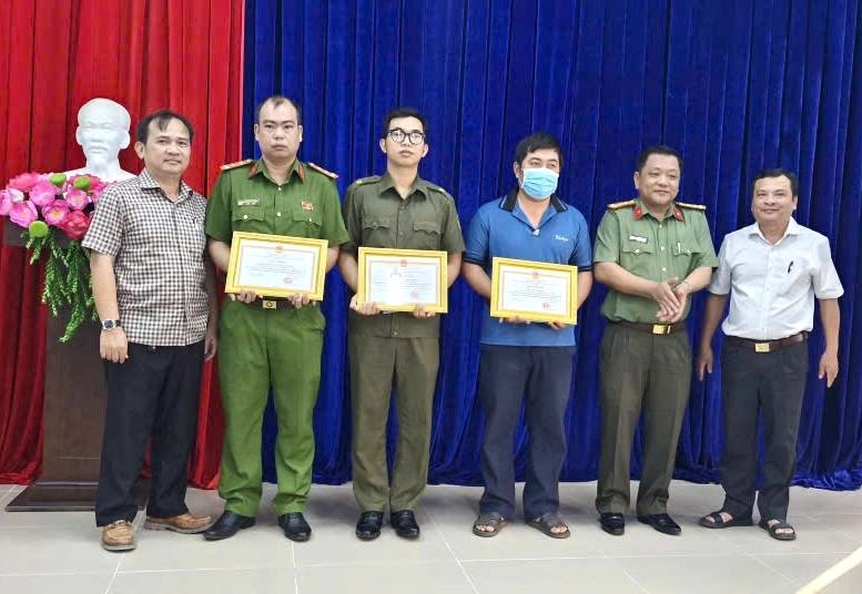 | Đại úy Nguyễn Nhật Trường và hai an ninh cơ sở được tặng Giấy khen. |