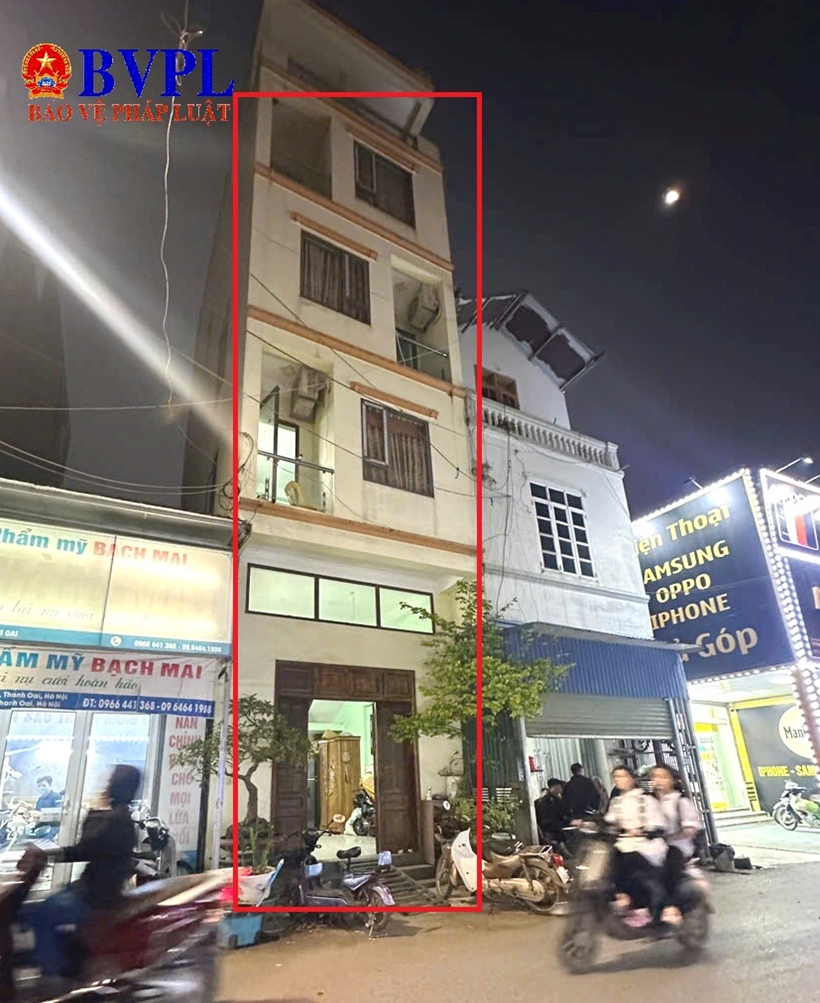 | Vụ việc được phát hiện tại trên tầng 2 nhà ông Ph. (khoanh đỏ). Ảnh: Nhật Minh. |