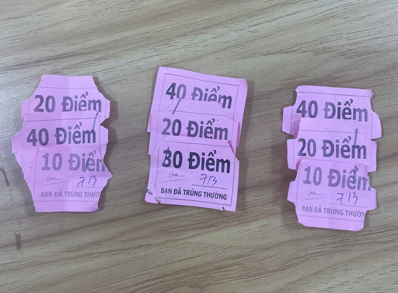 | Các lá thăm có in chữ “điểm”, từ 10, 20, 30, 40 điểm, để người chơi tích điểm để đổi thưởng giải đặc biệt lấy thoại di động Iphone. |