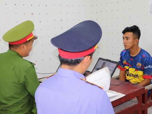 | Kiểm sát viên VKSND Khu vực 7, tỉnh Đồng Tháp phối hợp lấy lời khai đối tượng cướp tài sản. (Ảnh:CA) |