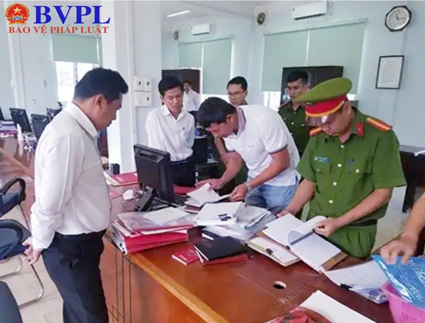 | Lực lượng công an kiểm tra tài liệu, chứng cứ tại Ngân hàng Nông nghiệp và Phát triển Nông thôn chi nhánh huyện Krông Bông. |