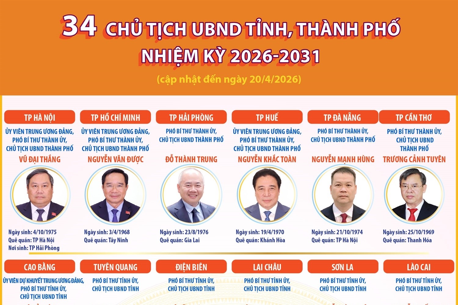 Thông tin về 34 Chủ tịch UBND tỉnh, thành phố nhiệm kỳ 2026-2031